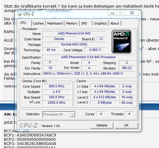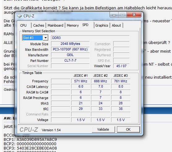also win habe ich vor knapp 2 wochen erst komplett frisch installiert, der grakatreiber (catalyst 10.6) ist neu und auch ohne "vorgänger". die festplatte ist auch noch ziemlich neu. steckverbindung im rechner sind alle ok. ich habe jetzt die nächsten ram-einstellungen im bios noch nicht gemacht... mache nachher erstmal die genannten screenshots. die minidump auswertungen habe ich auf der 1. seite des threads bereits gepostet, zumindest zu den ersten beiden fehlercodes.