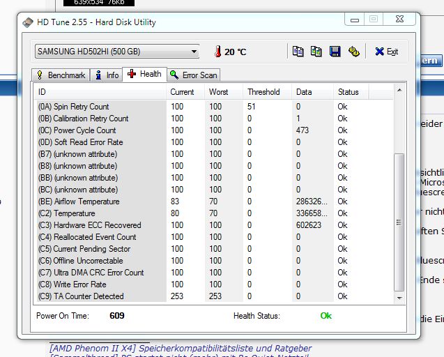 Poste uns auch die SMART-Werte deiner Festplatte (Screenshot HDTune Reiter "Health").