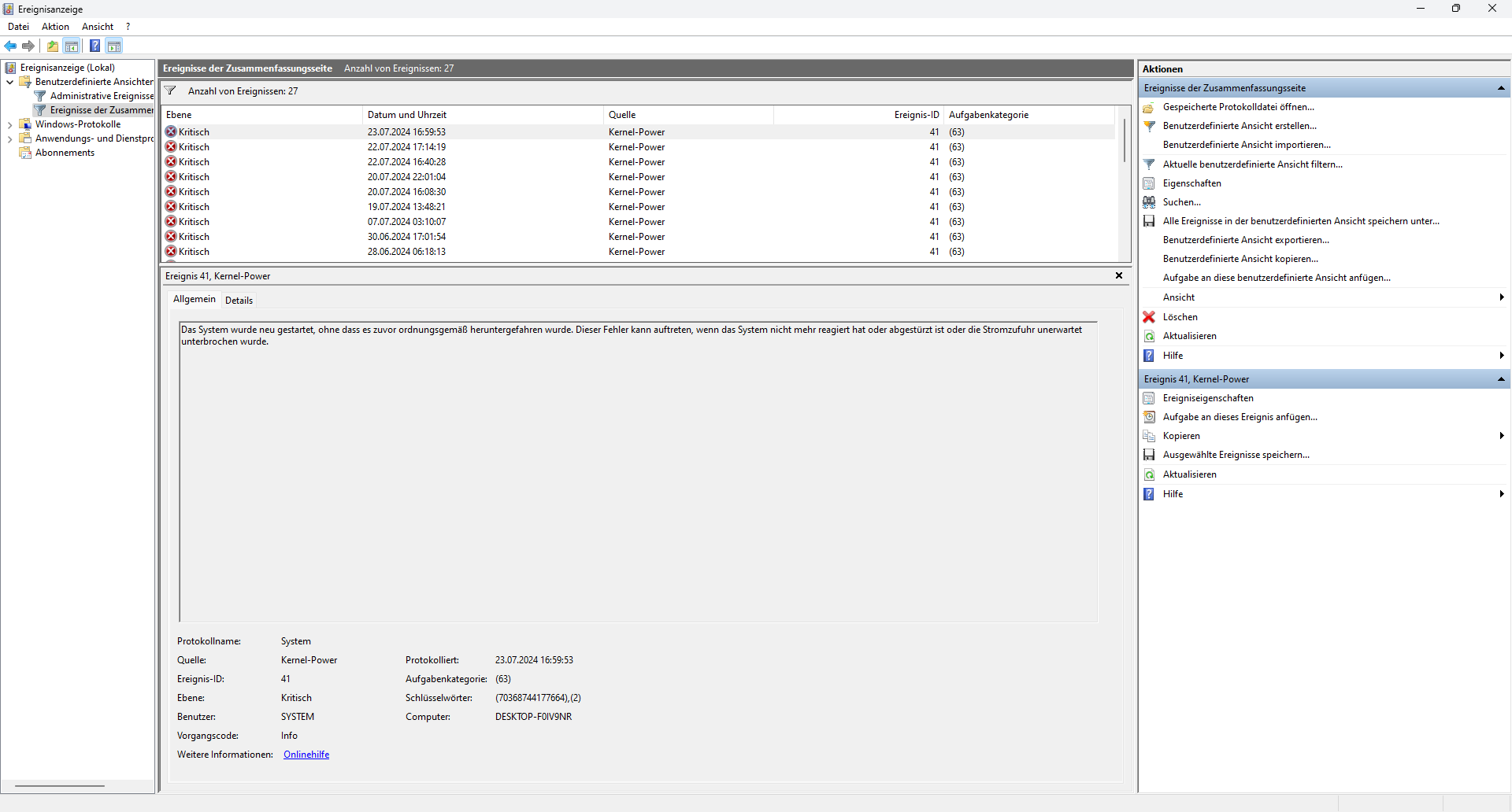 Windows Updates wurden gemacht, schnellstart wurde deaktiviert und das automatische neu starten wurde deaktiviert, da in der Ereignisanzeige ständig nur der nichts sagende Fehler 41 auftrat.