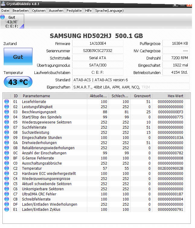 Die UDMA Fehler (SMART Werte) sagen aber etwas anderes. Diese werden i.d.R. durch ein defektes/fehlerhaftes Datenkabel verursacht. Im ungünstigsten Fall aber auch durch einen Controller-Fehler.