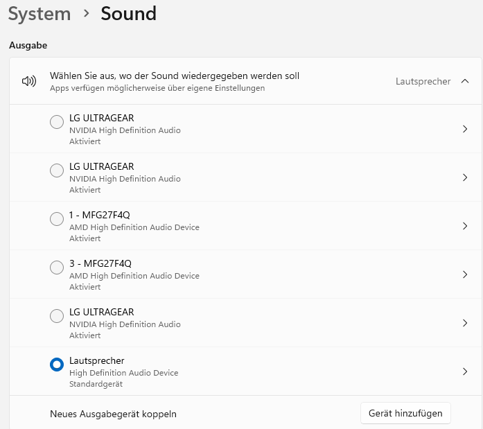 In aller Regel erkennen GPUs wenn ein Gerät mit Audio an DP oder HDMI hängt und du hast dann in Windows das HDMI Gerät als Ausgabe. Bei Nvidia heisst das oft Nvidia High Definition Outfit