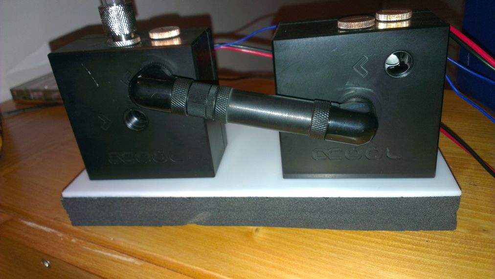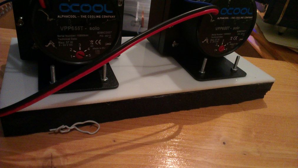 Die Pumpen sind jetzt entkoppelt, mit diesem schwarzen einseitig klebenden Schaumstoff, ich weiß nicht wie ihr ihn im PC-Bereich nennt (der hat da einen bestimmten Namen) aber bei mir ist das einfach nur Schaumstoff den ich von nem Bekannten in Massen aus der Firma bekommen habe