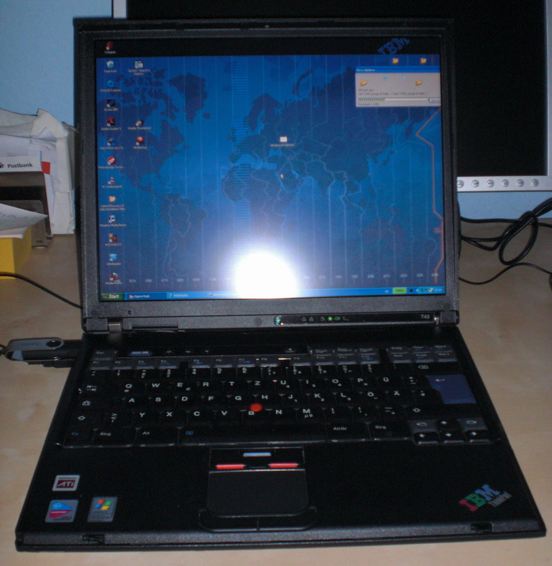 Das getestete Thinkpad entspricht der auf der Lenovo-Website aufgelisteten Konfiguration UC3F5GE zum Preis von 2227,20 Euro. Dieses T43 hat einen 1,86 GHz schnellen Pentium M 750 mit 512 MByte Speicher (Takt: 533 MHz, das derzeitige Maximum bei Centrino) und einen Grafikchip ATI Mobility Radeon X300 mit 64 MByte eigenem Speicher. Im Gehäuse steckt außerdem eine 60 GByte große Festplatte mit 5400 Umdrehungen pro Minute, ein 15-Zoll-Bildschirm mit einer Auflösung von 1024 mal 768 Bildpunkten, ein DVD- und CD-Brenner in einem Laufwerksschacht mit Hot-Swap-Funktionalität sowie eine WLAN-Karte von Intel für IEEE 802.11a/b/g.