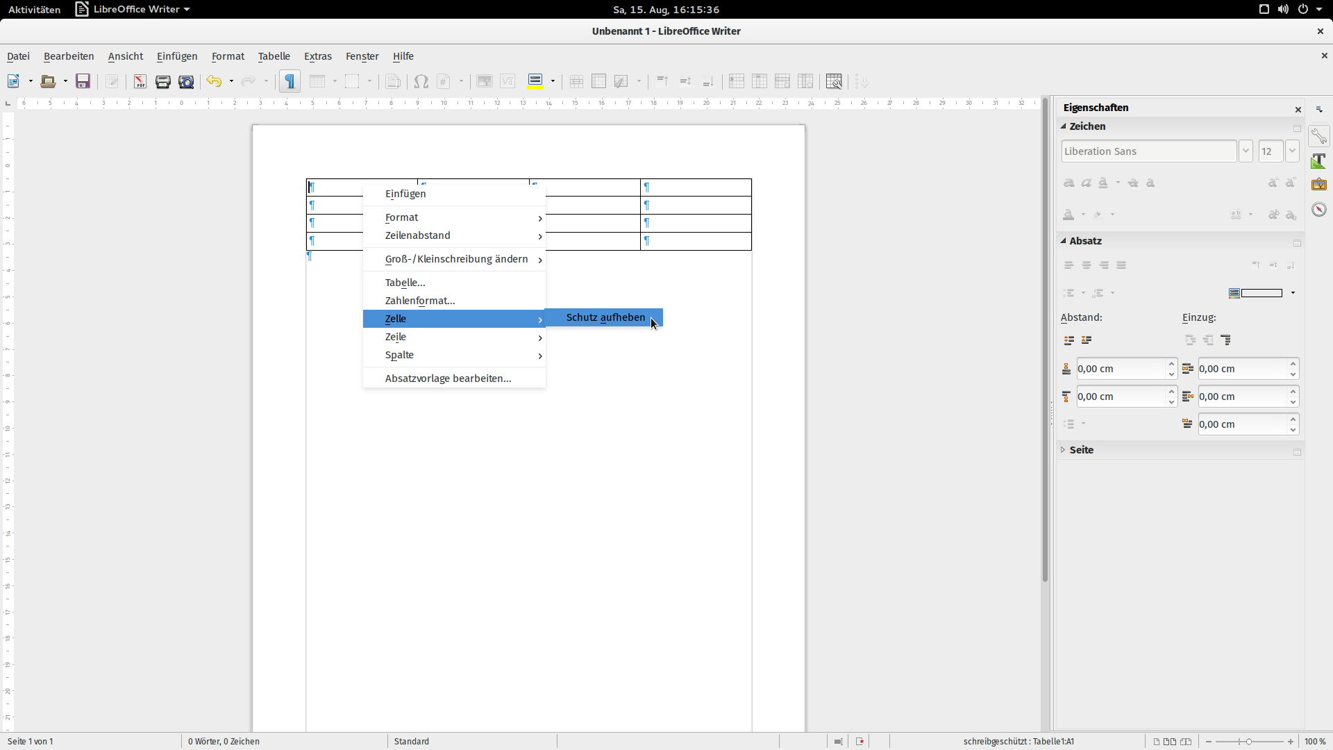 [TD="width: 975"] Setzen Sie den Cursor in die Zelle oder markieren Sie die Zellen. Wählen Sie zuerst, falls erforderlich, Extras - Optionen... - LibreOffice Writer - Formatierungshilfen und markieren im Bereich Cursor in geschützten Zonen - Zulassen. Öffnen Sie das Kontextmenü durch Rechts-Klick auf die Zelle und wählen Sie Zelle - Schutz aufheben.