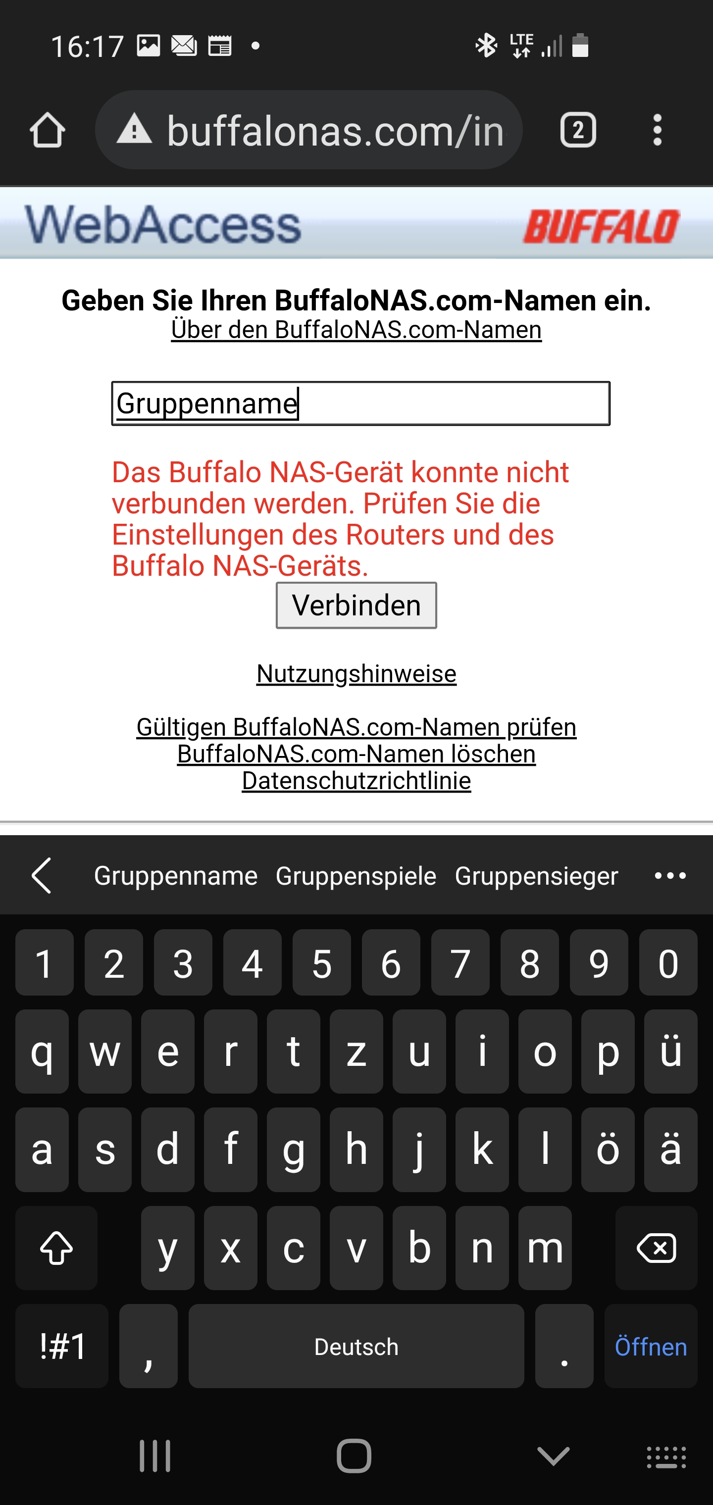 Das Buffalo NAS Gerät konnte nicht verbunden werden. Prüfen Sie die Einstellungen des Routers und des Buffalo NAS Geräts.