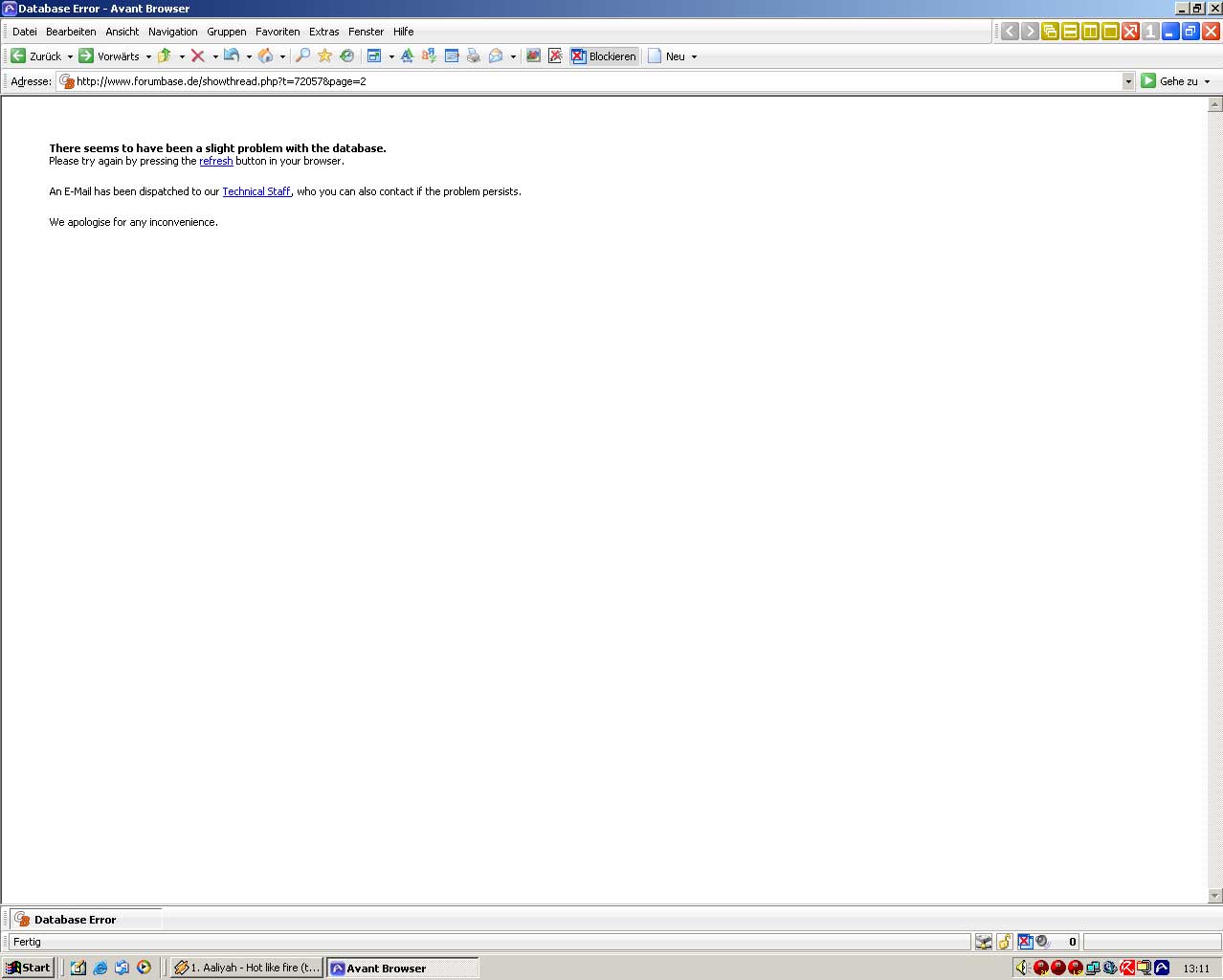 So, Steffen, also irgendwie ist schon wieder der Wurm drin. Gemerkt habe ich es, als ich diesen Post ein weiteres Mal editieren wollte. Da die Änderung nur kurze Zeit in Anspruch nahm, dürfte es ca. 14.08 Uhr gewesen sein als ich auf den Button "Anderungen speichern" klickte. Es vergingen ca. 3 - 4 Minuten in denen sich nichts tat - außer daß der Balken in der Statusleiste immer länger wurde, danach schloß ich das Fenster und versuchte die Änderung am Beitrag erneut durchzuführen - selbes Ergebnis. Ich wartete hier jedoch noch etwas länger und schließlich spuckte vBulletin eine Meldung aus (siehe Anhang).