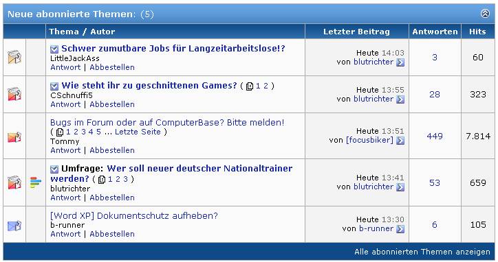 Und wenn ich einen Beitrag schreibe und anschließend wieder ins Kontrollzentrum wechsle, steht mein eigener Beitrag an "ungelesen" da... auch noch nach einem Reload der Seite! Ich muß selbigen Beitrag ein zweites Mal anklicken, damit er als gelesen gekennzeichnet wird und nicht al neuer Beitrag im abonnierten Thread.