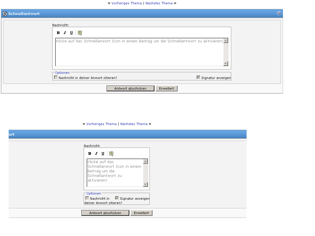 werkam schrieb:Seht Euch das Bild mal an, bei einigen Beiträgen, wenn ich antworten will bekomme ich ein kleines Fensterchen, da passt gerade mal ein Wort rein, bei anderen ist es der halbe Bildschirm. Liegt es an meinem Rechner oder am Forum.