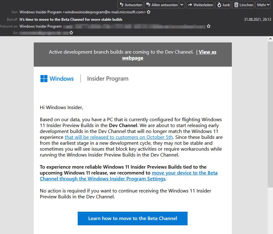 @SKu - Weil Du im Dev-Kanal geblieben bist und damit bereits an der Final vorbei bist, ist doch klar. Microsoft hat eine Mail an Insider geschickt in der klar gestanden hat, man soll in den Betakanal wechseln, wenn man auf die finale Version will. Die Mail kam bei mir am 31.8. also vor fast einem Monat: