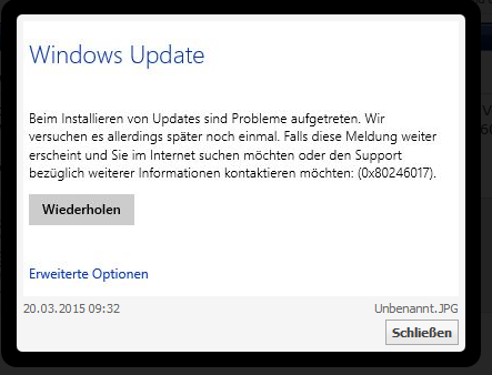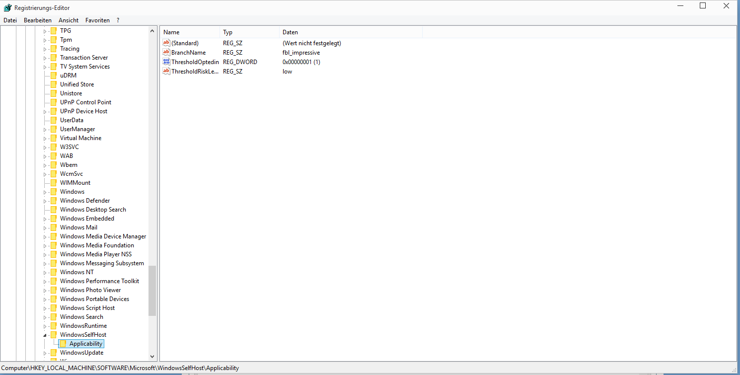 Ich habe das Problem, das wenn ich bei Windows Updates (mit Einstellung schnell) mein Build auf 10041 updaten will, das immer der Fehlercode 0x80246017 kommt und ich habe auch bei regeit bei HLM/SOFTWARE/Microsoft/WindowsSelfHost/Applicability schon die 2 Blauen Datei gelöscht und trotzdem funktioniert es nicht. Immer wenn ich es lösche und nach updates suche kommt nochmal der Fehler geh ich dann im nachhinein wieder in regedit geh ist die eine blaue Datei ThresholdOptedin wieder da.
