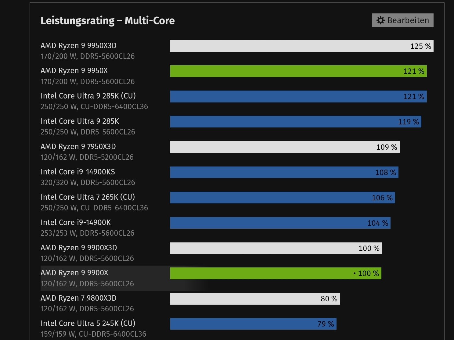Wie kommst du auf 20 vs. 8 ? Der 9900X ist ein Zwölfkerner, der 265K hat zwar zwanzig, davon sind aber 8 performance Kerne und 12 E-Kerne, also Effizienzkerne.