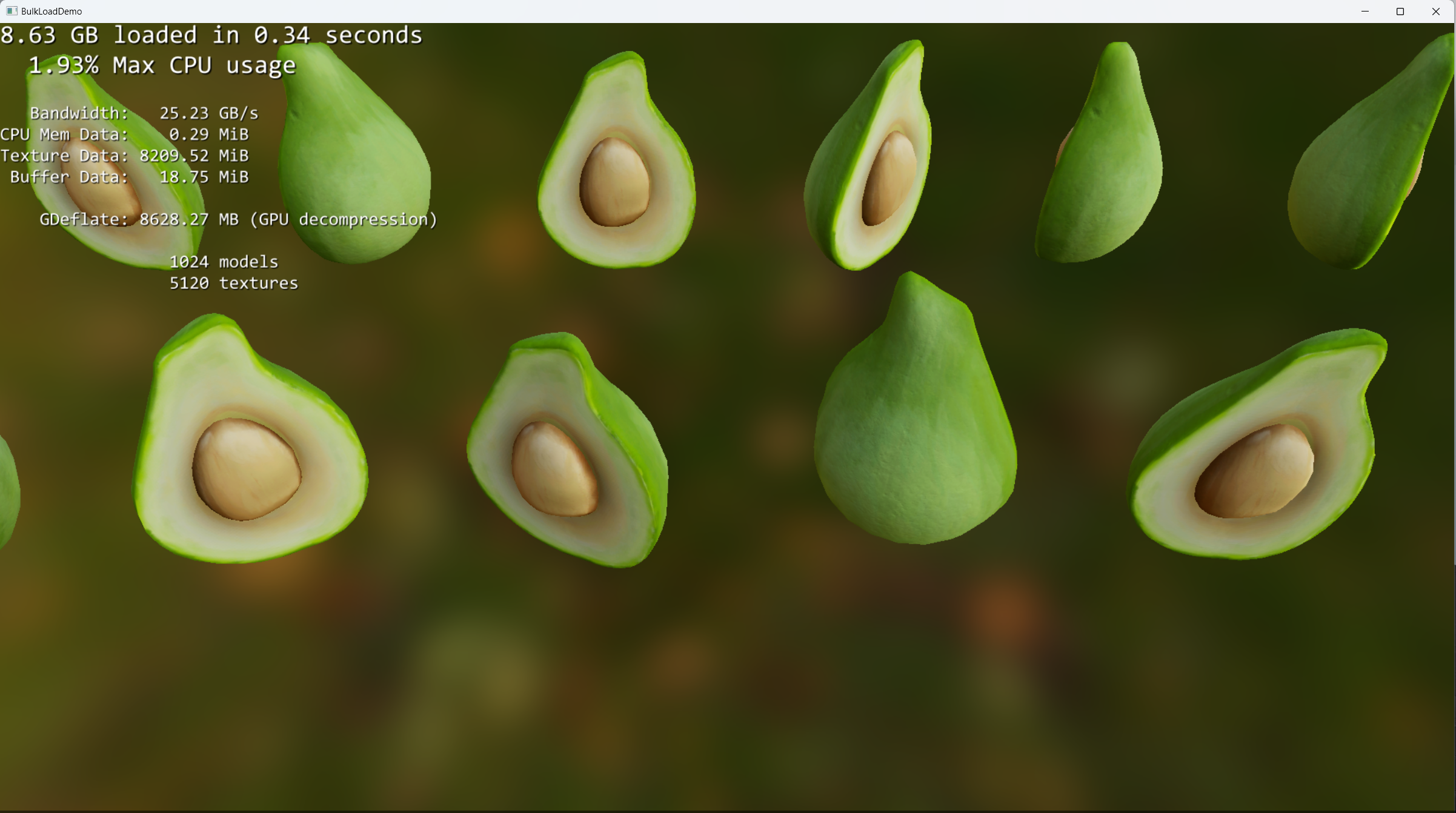 Zum Test: BulkLoadDemo Benchmark: Die Community testet DirectStorage 1.20 mit Avocados 🥑