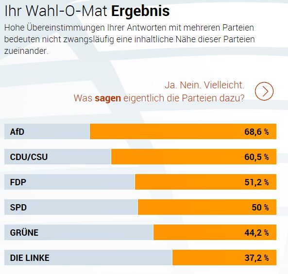 Diese Wahl: Die PARTEI mit 60%.......... ne da setze ich mein Kreuz sicher nicht. Gefolgt von der AFD und CDU.... AFD?! Ich habe alle "rechten" Thesen neutral oder eben nicht rechts beantwortet, wo zur Hölle stimme ich mit denen noch überein?