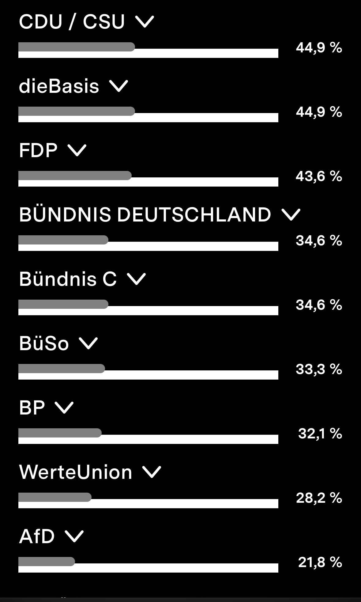 Bei mir ist die AFD auf Platz 1 mit knapp 60% Übereinstimmung