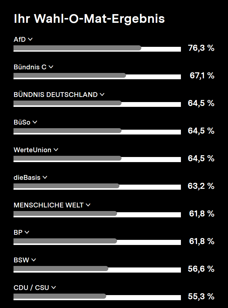 Bei mir trifft der eigentlich immer wie die Faust aufs Auge. Die AfD ist, selbst wenn ich alle Parteien zum Vergleich ziehe, immer die letzte Partei mit den allerwenigsten Übereinstimmungen.