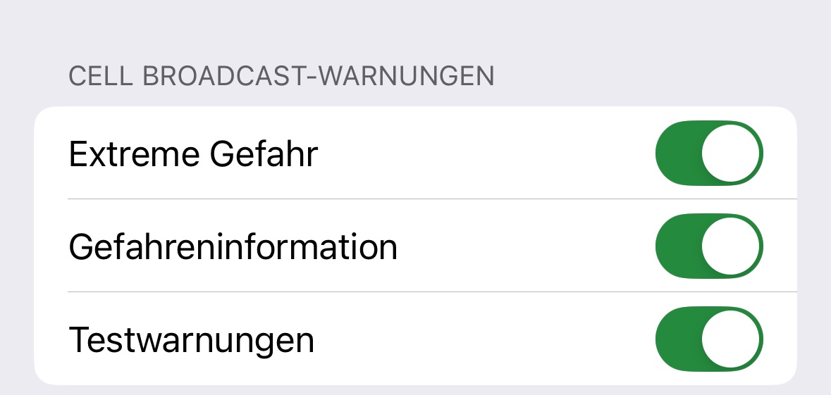 Du bekommst immer nur eine Warnung zu sehen, weil das System Deines Smartphones registriert, dass diese Warnung schon angekommen ist und die Warnung ja nur einmalig abgestrahlt wird.. Der Screenshot, den ich weiter oben von der heutigen Probewarnung angefertigt hatte, stammte übrigens von der archivierten Meldung, nicht von 11:00.Weyoun schrieb:Wenn man "regulär" eingeloggt ist (man also Funkkontakt zu drei bis 6 benachbarten Mobilfunkzellen hält, aber nur in einer wirklich "drin" ist), dann erhält man also nicht nur CB Nachrichten der einen Zelle, sondern von allen, die in Reichweite des Handys sind?