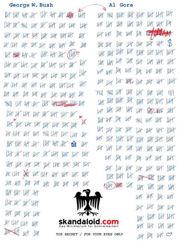 Man munkelt drüber Bush stehe hauptsächlich auf Sharons Seite um nicht noch mehr Wählerstimmen zu verlieren, den schließlich haben die Jüdischen Bürger in Miami damals die Wahl entscheiden! George Bush liegt bei Umfragen vom Montag bei ca. 50%, das lässt doch hoffen das er bei der Wahl darunter liegt, weit darunter!!
