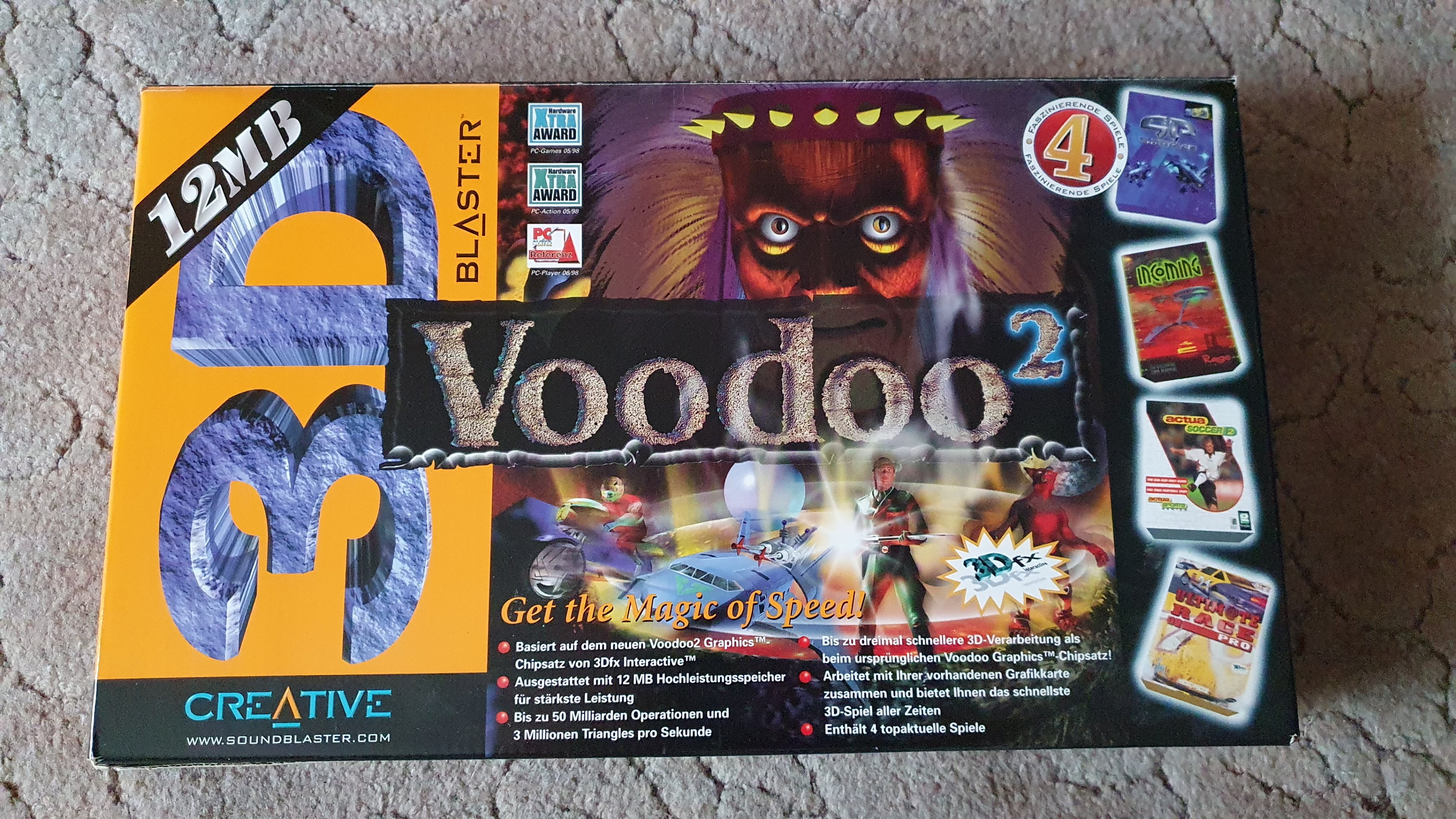 Gestern mal kurz die Verpackung der Voodoo 2 rausgekramt. Die Karte ließ sich damals sogar übertakten, etwa 20 Prozent waren locker drin. Damals ja noch komplett ohne Kühlung unterwegs konnte man mit einem alten Pentium-Kühler + Lüfter einiges reißen!