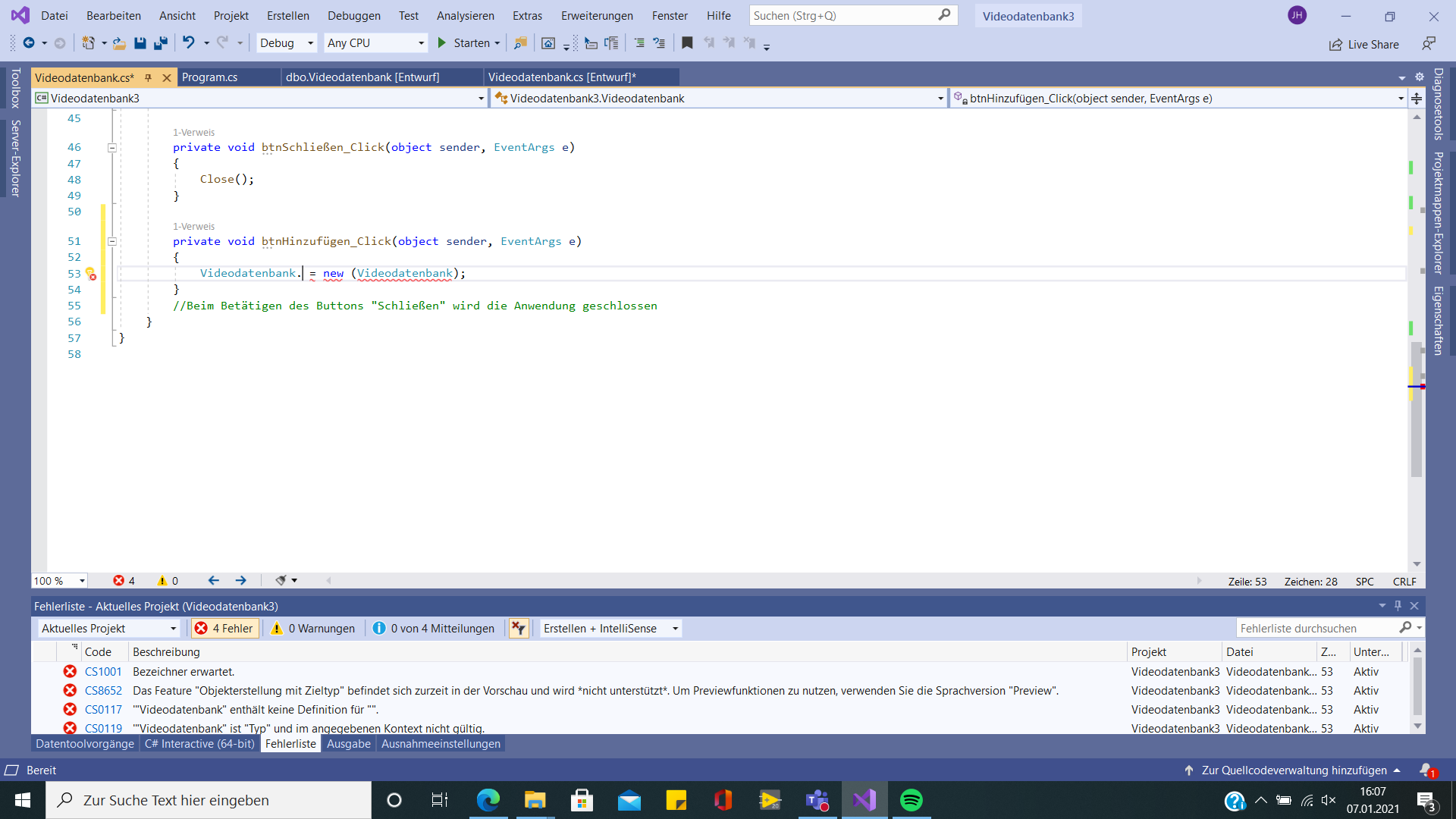 ich habe eine Datenbank in C# erstellt welche auch soweit funktioniert. Wenn ich allerdings das Programm ausführe und nun auf neuen Eintrag hinzufügen klicke und danach auf Speichern, speichert er zwar den Eintrag in dem Moment aber wenn ich das Programm schließe und wieder neu öffne ist der Eintrag nicht mehr da. Hat wer eine Idee wie man das lösen kann das der Eintrag beim erneuten Ausführen des Programms noch da ist ?