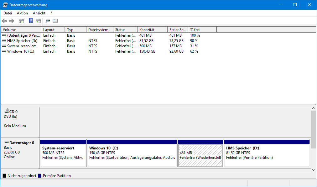 Wenn ich mir das jetzt aber anschaue, dann befindet sich zwischen C und E noch eine 450MB große Partition, die vermutlich von Win 10 kommt.