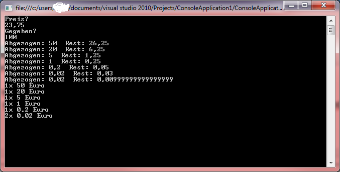 Mein Programm tut das in vielen Fällen auch richtig aber z.B. bei Preis = 23,75 und gegeben = 100 gibt es mir statt einem 5 Cent Stück, zwei 2 Cent Stücke, wodurch ein Cent fehlt.