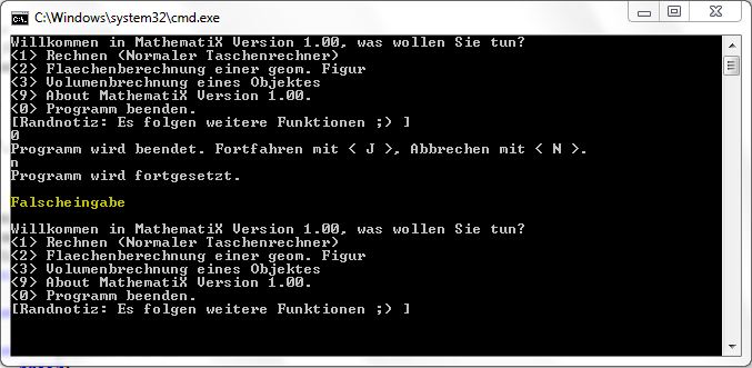 Ich habe heute Abend begonnen ein C-Programm zu schreiben um etwas zu üben. Wollte ein Programm schreiben in dem Alles irgendwie vorkommt. Das Programm hat ein Menü in welchem ausgewählt werden kann welche Funktion man benutzen möchte (Die Funktionen sind noch nicht geschrieben, habe den Aufruf erstmal mit Printf ausgefüllt ^^). Wenn man 0 eingibt soll in diesem Menü auf erneute Bestätigung das Programm beendet werden. Nun das Problem: Wenn ich 'n' eingebe kommt zwar das Programm wie ich es vor hatte, jedoch kommt "Falscheingabe" aus der int main dazu