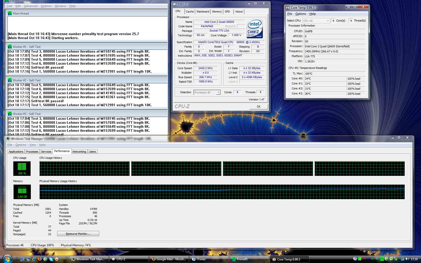 Das ist in den meisten (einfachen) BOINC-Anwedungen der Fall, es gibt Ausnahmen von Projekten, die weitere CPU-Befehlssätze (wie SSE2, SSE3 usw.) nutzen können. Dennoch erreichen diese seltenst die Temperatur-Entwicklung wie durch prime95 (je nach Konfiguration; Hintergrund siehe wikipedia). Eine pauschale Erklärung ist mir nicht bekannt, vielleicht greift die prime-Software effizienter auf die Kerne zu als andere Prozesse (die über die BS-Software auf die Einzel-Kerne verteilt werden) oder temperatursenkende (Takt-)Phasen kommen weniger häufig vor. Wer Genaueres weiß, bitte ergänzen. Interessieren würde mich, ob eine andere Quad-Architektur (AMD-Phenom) weniger "anfällig" ist für die Temperatur-Unterschiede als die Intel-Quads. Ein Kriterium für Quad-Effizienz ?!