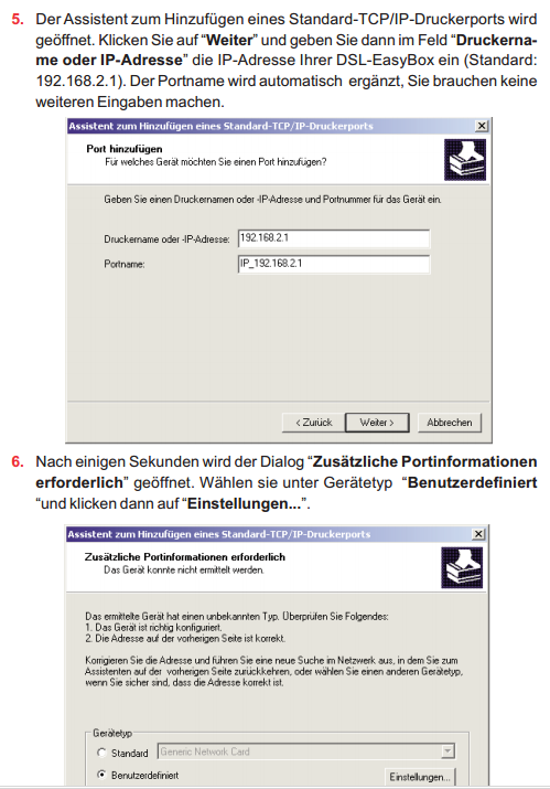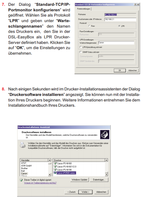 Eingestellt ist der Drucker wie in der Anleitung zur EasyBox beschrieben. Siehe Screenshots mit den Einstellungen.