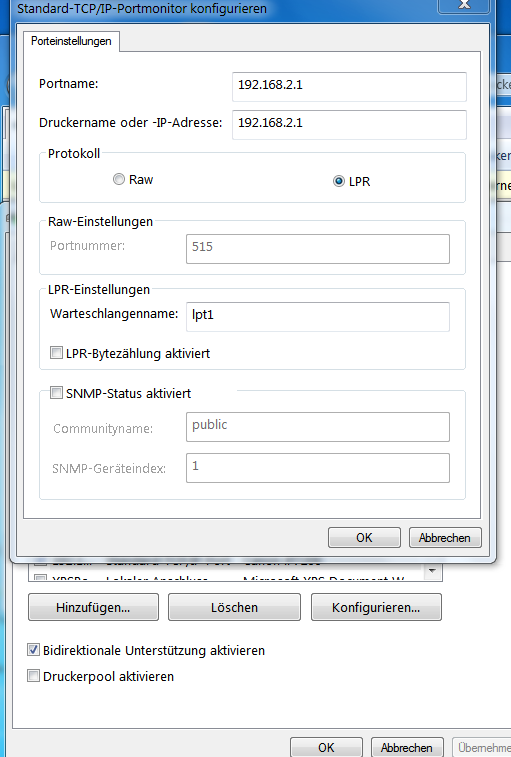 Am PC: Probiert wurde bereits ein anderer Warteschlangennamen, LPR-Bytezählung aktiviert, sowie Druckerpool aktiviert und Bidirektionale Unterstützung deaktiviert.