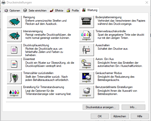 Ich drucke seither nur noch mit der Druckqualität auf Hoch. Und wundere mich, dass es mit der Einstellung Standard zu Schlieren/Streifen und Lücken kommt. Woran mag das liegen? Das merkwürdige ist, dass es mit der untersten Druckqualität -Schnell- besser ist als mit -Standard-. Mit besser meine ich, dass man es halbwegs trotz Streifen gebrauchen kann. Bei -Hoch- ist es 1A !
