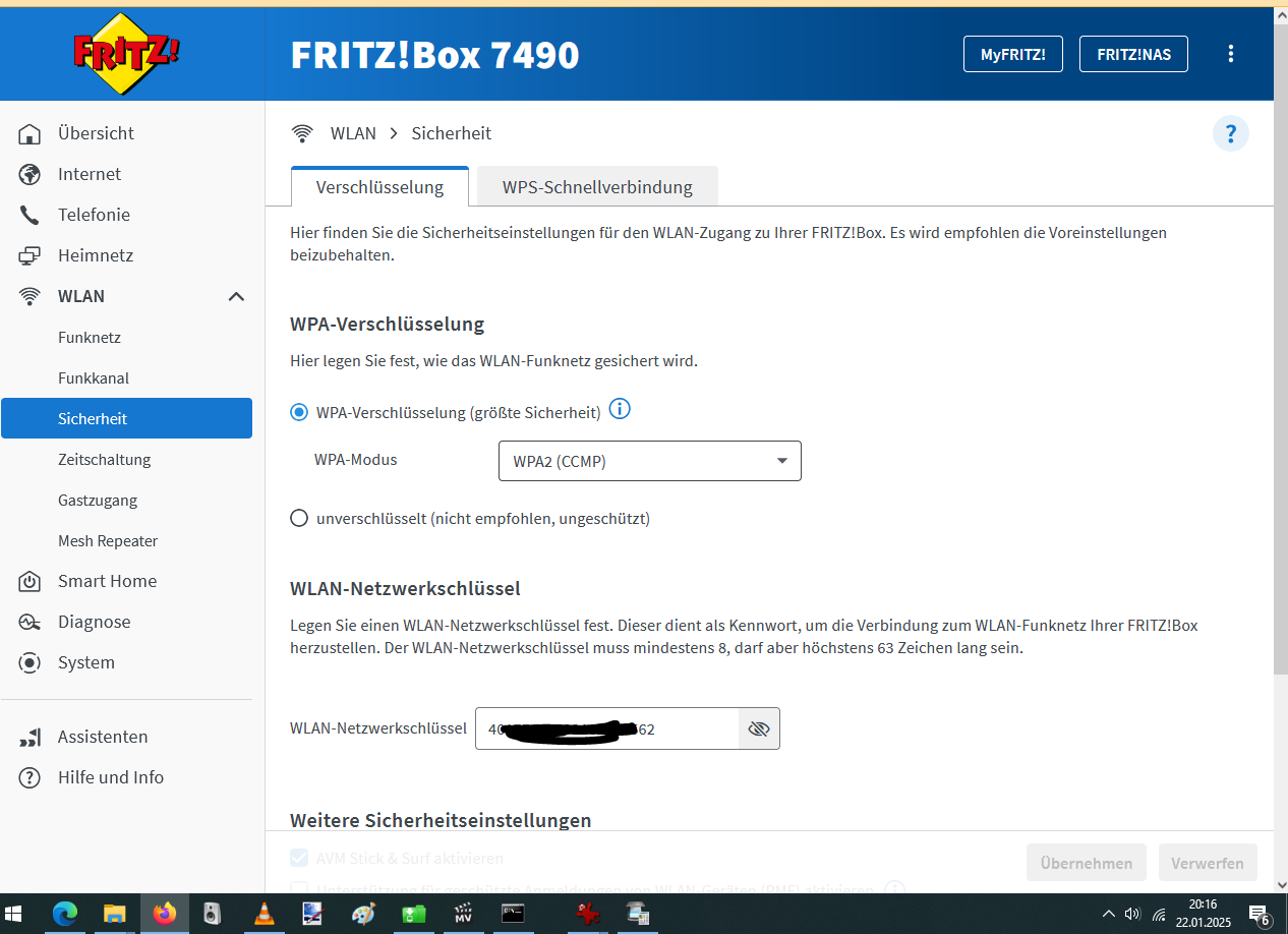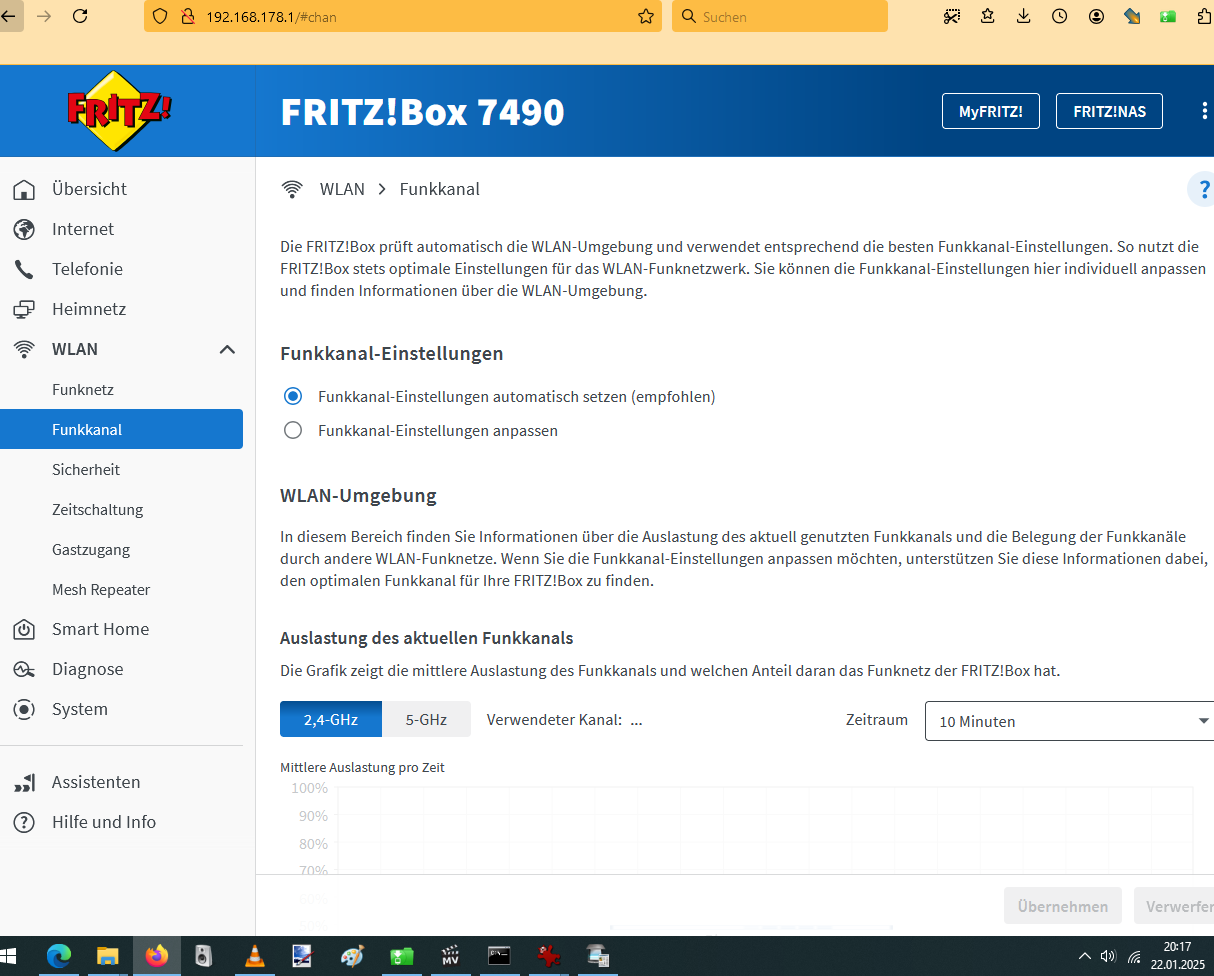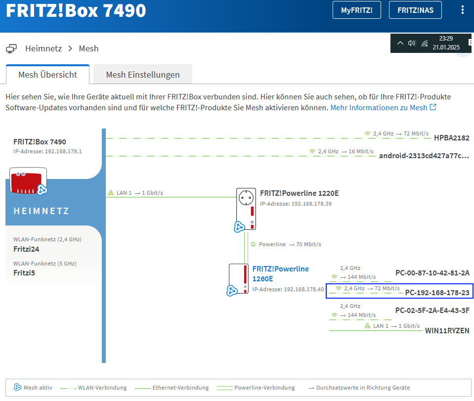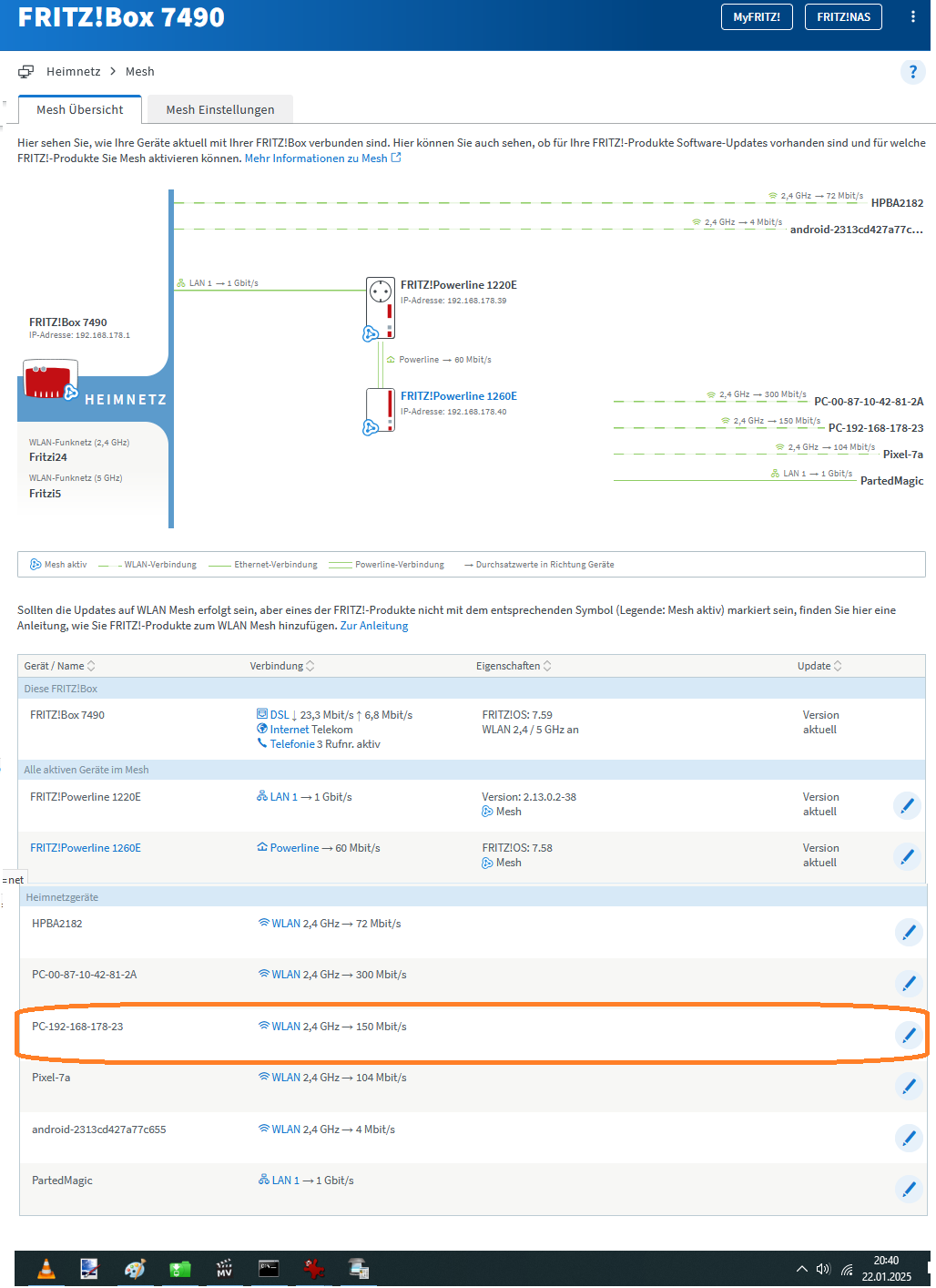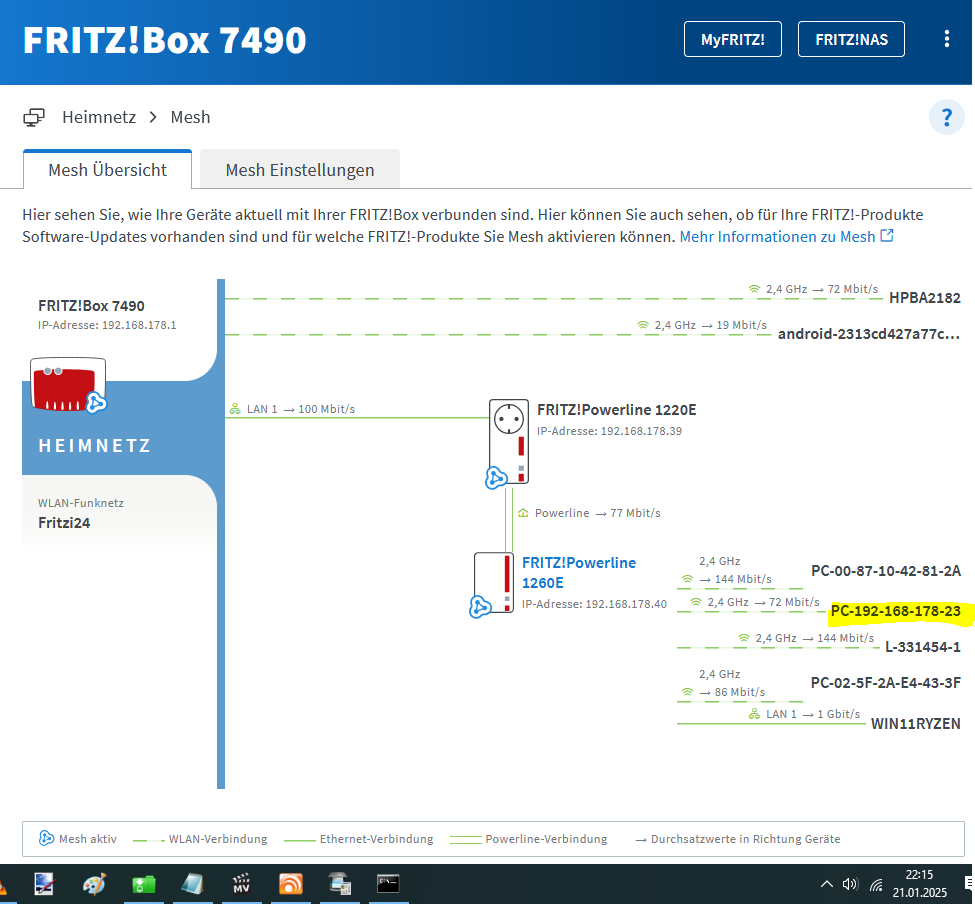 ). Er ist mit WLAN im Netzwerk, verbunden mit dem Access Point eines Fritz!Powerline-Adapters 1260E (FW 7.58), der wiederum über einen 1220E Powerline-Adapter an der Fritz!Box 7490 (ein Stockwerk über mir; FW 7.59), LAN-Port 1 hängt.