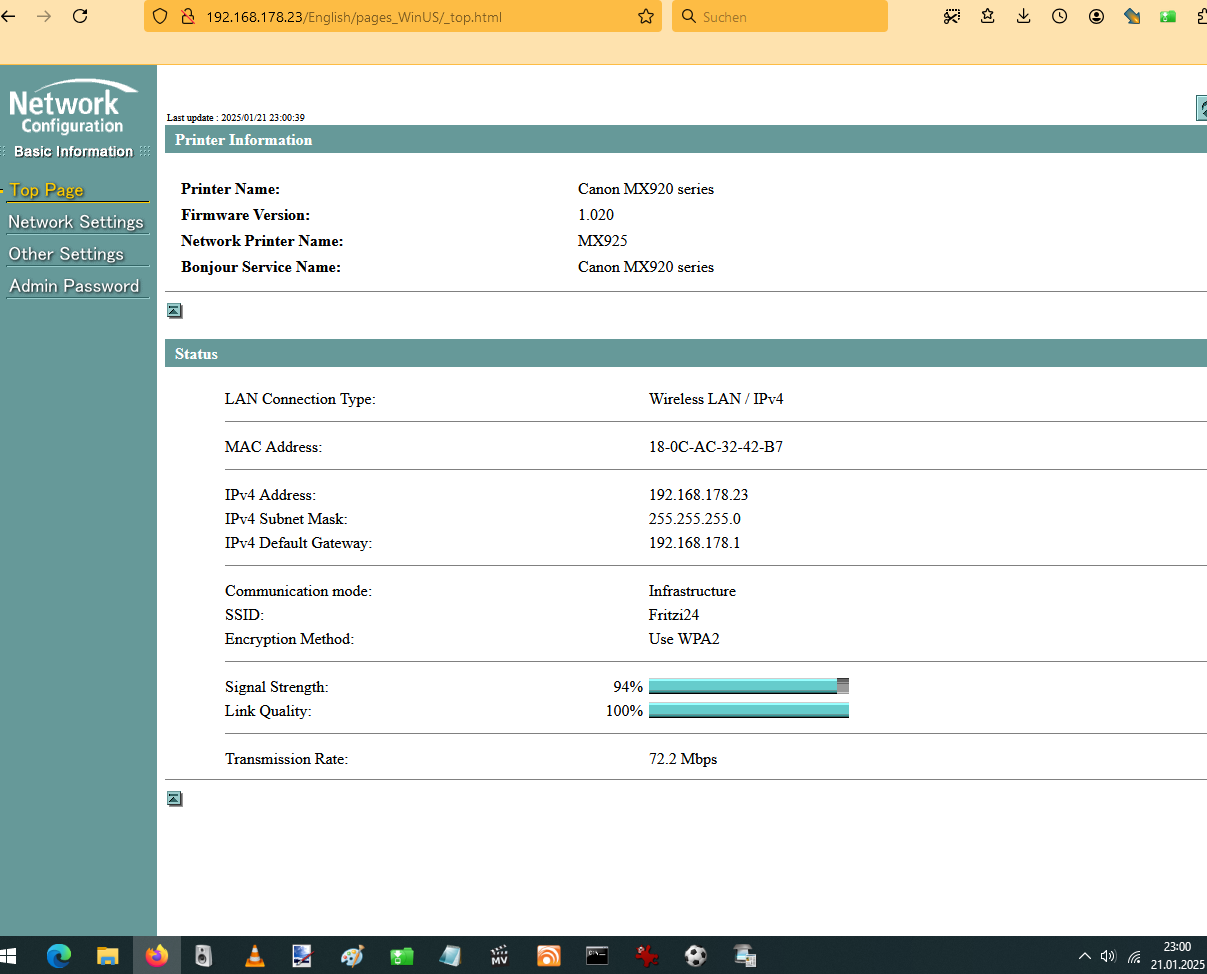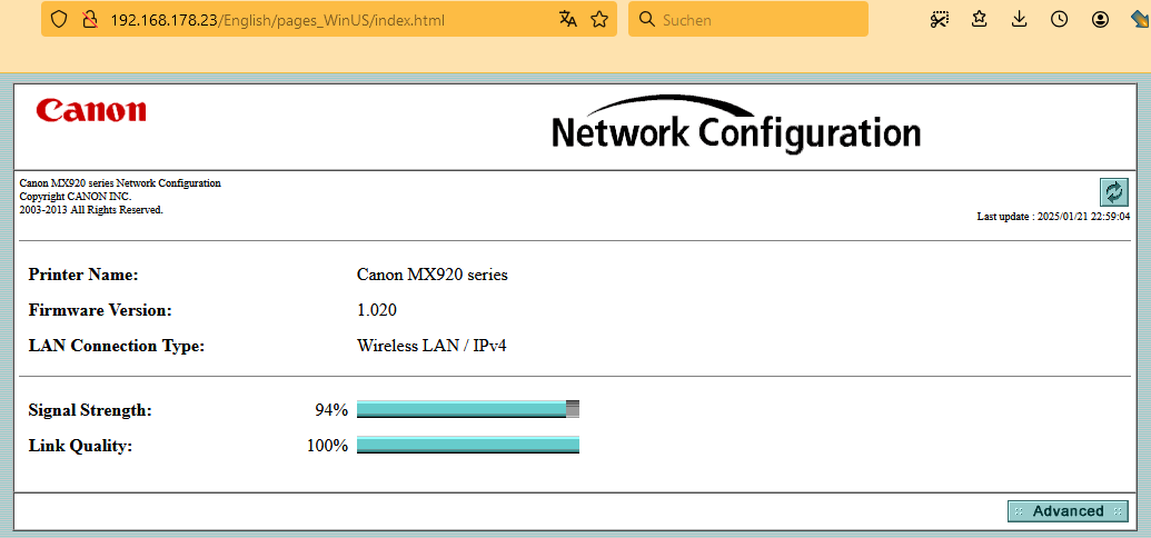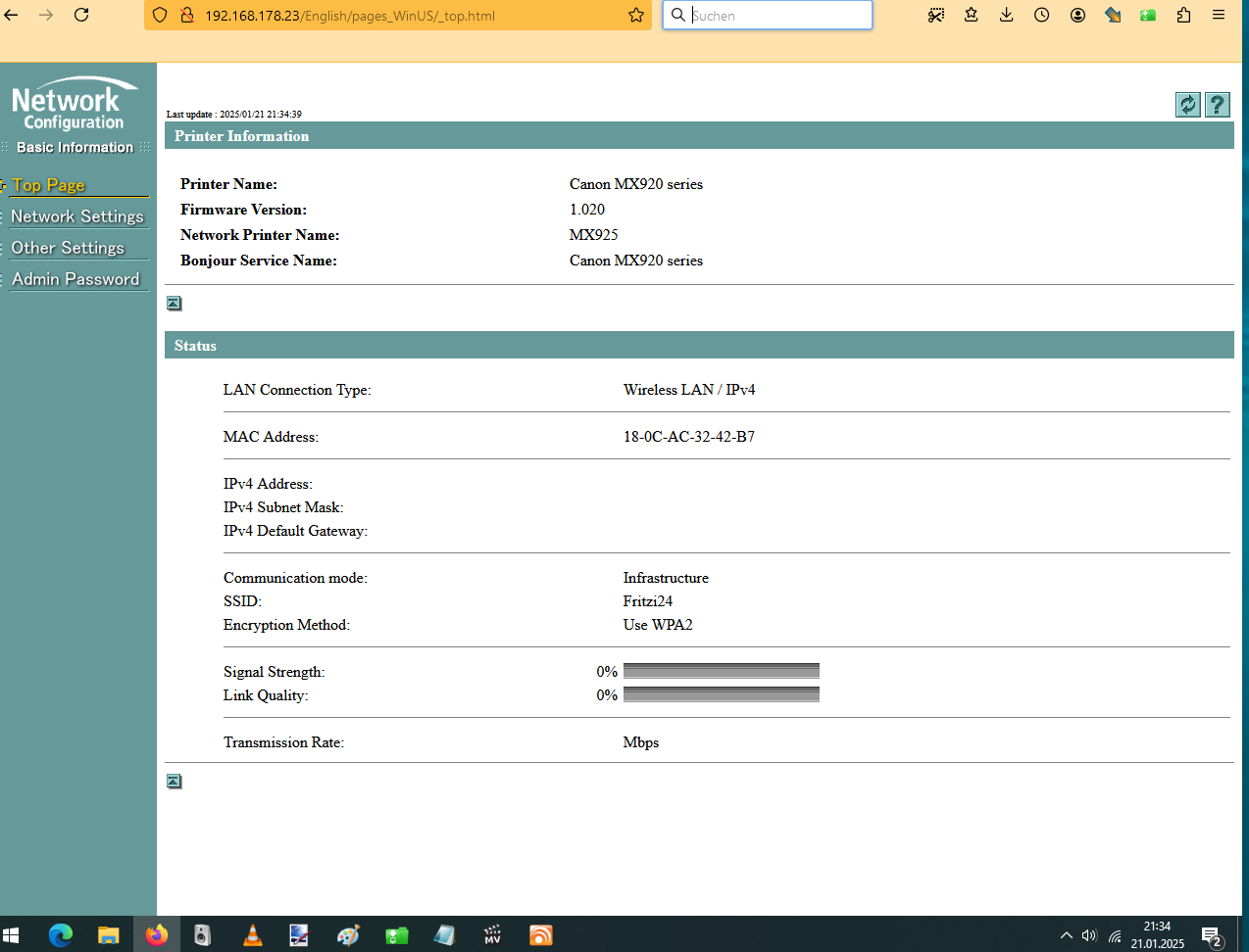 Ich habe die Einstellungen überprüft, bin mal auf WPS zur Kontrolle (aber nicht gestartet weil's ja schon verbunden war), bin die WLAN- und IPv4-Einstellungen durchgegangen, habe den Host-Name MX925 nochmal eingegeben bzw. bestätigt mit OK, und danach ging's plötzlich. Er hat mir dann auch im Webinterface die Signalstärke angezeigt, wo vorher überall 0 % stand.