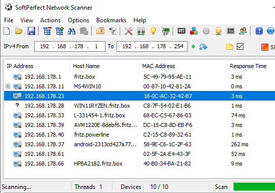 - arp -a zeigt den Scanner auch an, ebenso wie netscan (aber ohne Hostname)