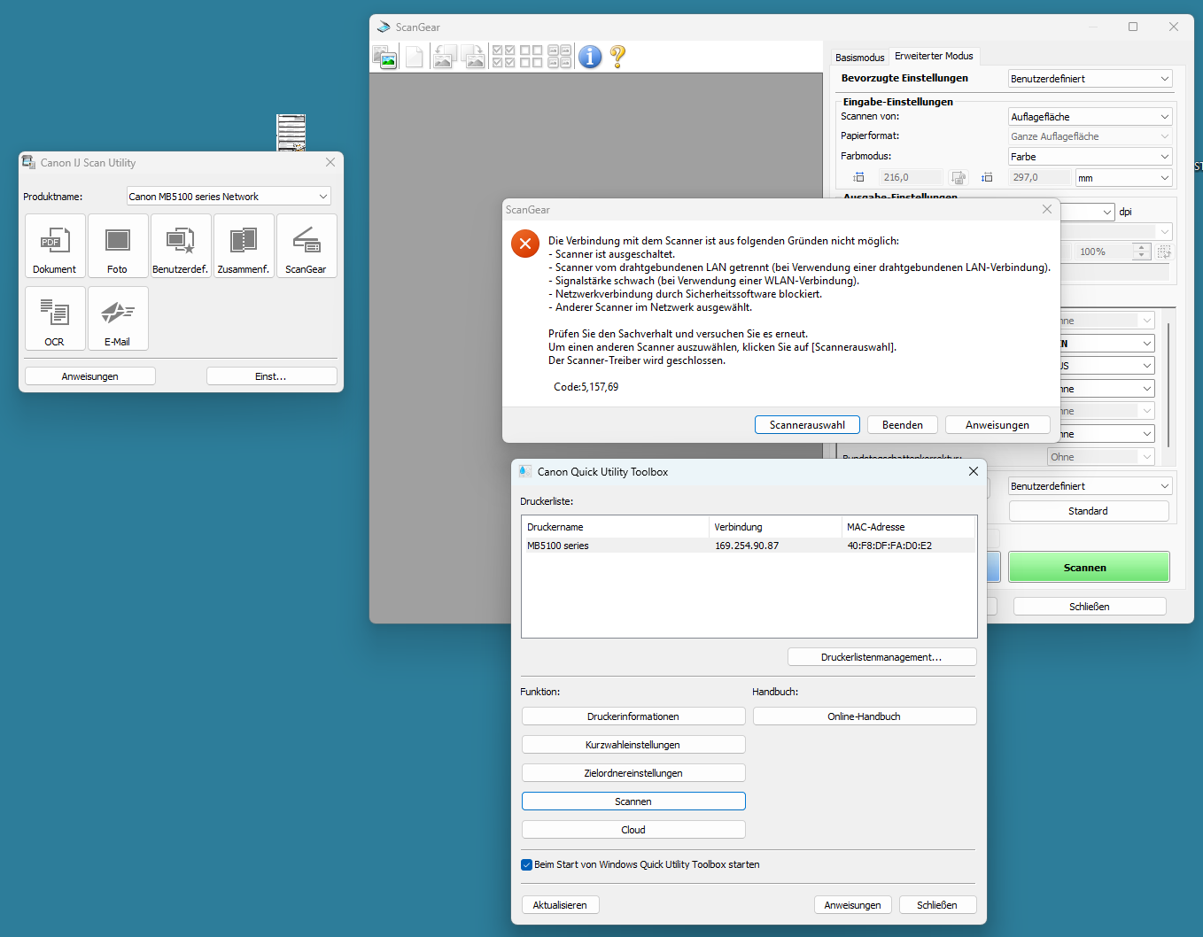 Die Woche drauf konnte ich natürlich nichts mehr scannen, musste erst den Scanner mit "neuem" WLAN der FB verbinden. Tat ich mit WPS, war auch wieder nicht ganz einfach, trotz Anleitung. Die Woche drauf, beim zweiten Mal, ging's aber plötzlich (wieder!) nicht mehr. Beim Scannen meldete mir das IJ Scan Utility "ScanGear - Code:5,157,69 - ... Verbindung ... nicht möglich ..."