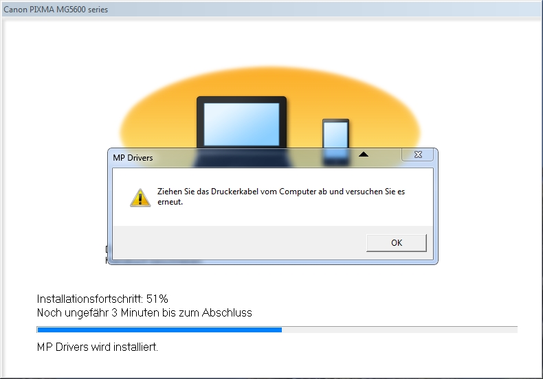 Und nun bekomme ich jedes mal, wenn ich die MP- Treiber installieren will die Fehlermeldung vom Screenshot. Obwohl ich seit Jahren meine Drucker an der Fritzbox angeschlossen hatte (per AVM Fernanschluß). Also kein Druckerkabel benutzt wurde.