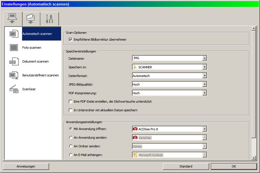 Bei Fotoscan und Dokumenten Scan geht das aber und es kommt ein Jpg raus das sich dann mit Acdsee 8 automatisch öffnen
