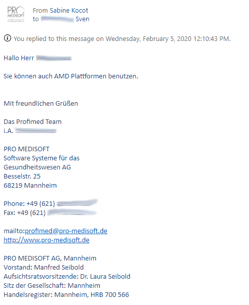 Nimm mal die Kosten für einen kleinen Server mit etwas drumherum, bist du bei 10k. Nimm den Preisunterschied zwischen Intel und AMD Hardware, kommst je nach Szenario bei den kleineren CPUs bei 500€ aus. Dann beantworte dir einfach mal die Frage wieso du die Garantie für die Funktionsfähigkeit und mögliche Regressforderungen auf die eigene Kappe nimmst, wenn es schon der Softwarehersteller nicht machen will und wie begründest du die lächerlichen 500€ gegenüber dem Kunden wenn was nicht läuft.