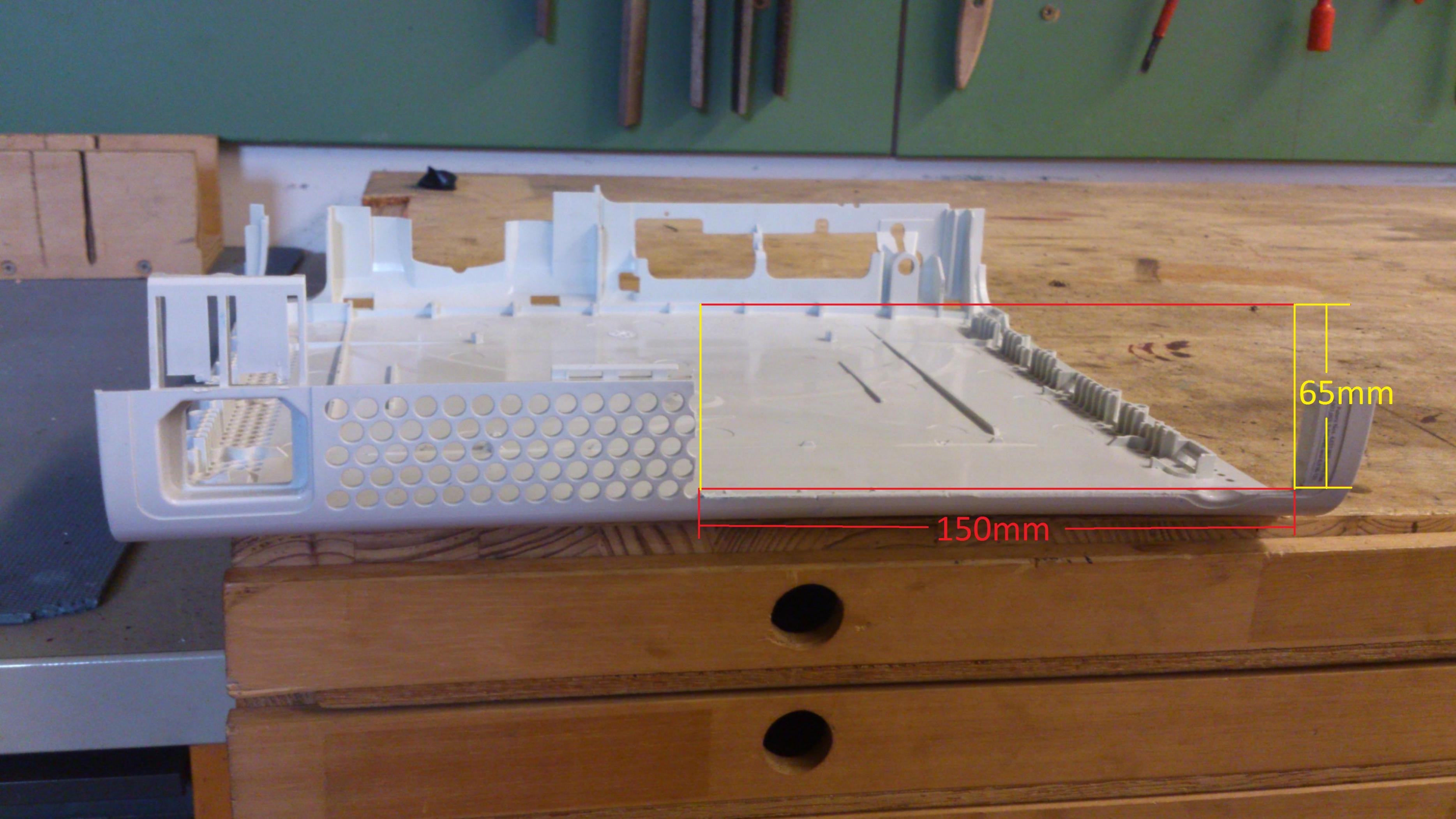 2. Nun bleibt uns noch der "Deckel" der XBox. Ihr müsst nun gucken, wie hoch euere Grafikkarte ist, auch hier übtertrifft meine Graka die Maße (110mm) und ich bekomme ohne weiteres die Grafikkarte nicht in die XBox was für mich heisst, dass ich die Oberfläche aufsägen muss. Die Maße findet ihr nicht unbedigt auf der Herstellerseite aber sie sind meist bei Alternate.com gelistet. Es geht hier am einfachsten mit einer Laubsäge. Auch hier habe ich wieder mehr Platz an den Kanten gelassen, damit dort Kanteschutz hinkommt. Es werden auch hier wieder die Kanten mit einem Stahlmaß entgratet. Nach diesem Arbeitsschritt habe ich das zuvor gemssene Rechteck hinten in der XBox.