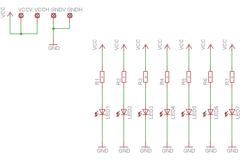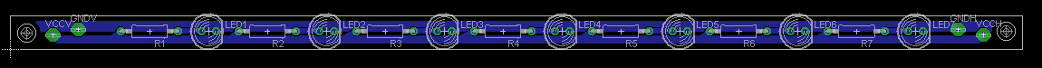 Auch heute entworfen wurden das Platinen Layout für die LED'S, es sind sehr hell leuchtende LED's mit einem Durchmesser von 3mm, und werden mit einer Spannung von 3,4 Volt bis 4,0 Volt. Die LED'd arbeiten mit einem Strom von ca.20mA als max. sind hier 30mA gegeben. Ein normaler Molex-PC-Stecker gibt 5V DC aus. Daraus errechnet sich der Vorwiederstand für jede LED von 75Ohm, wenn diese alle Parallel geschaltet werden. Insgesamt werden 3 LED-Streifen gefräst, 2 davon sind 180mm lang, die andere 100mm. Die Streifen werden einfach mit Leitung zusammen gelötet.