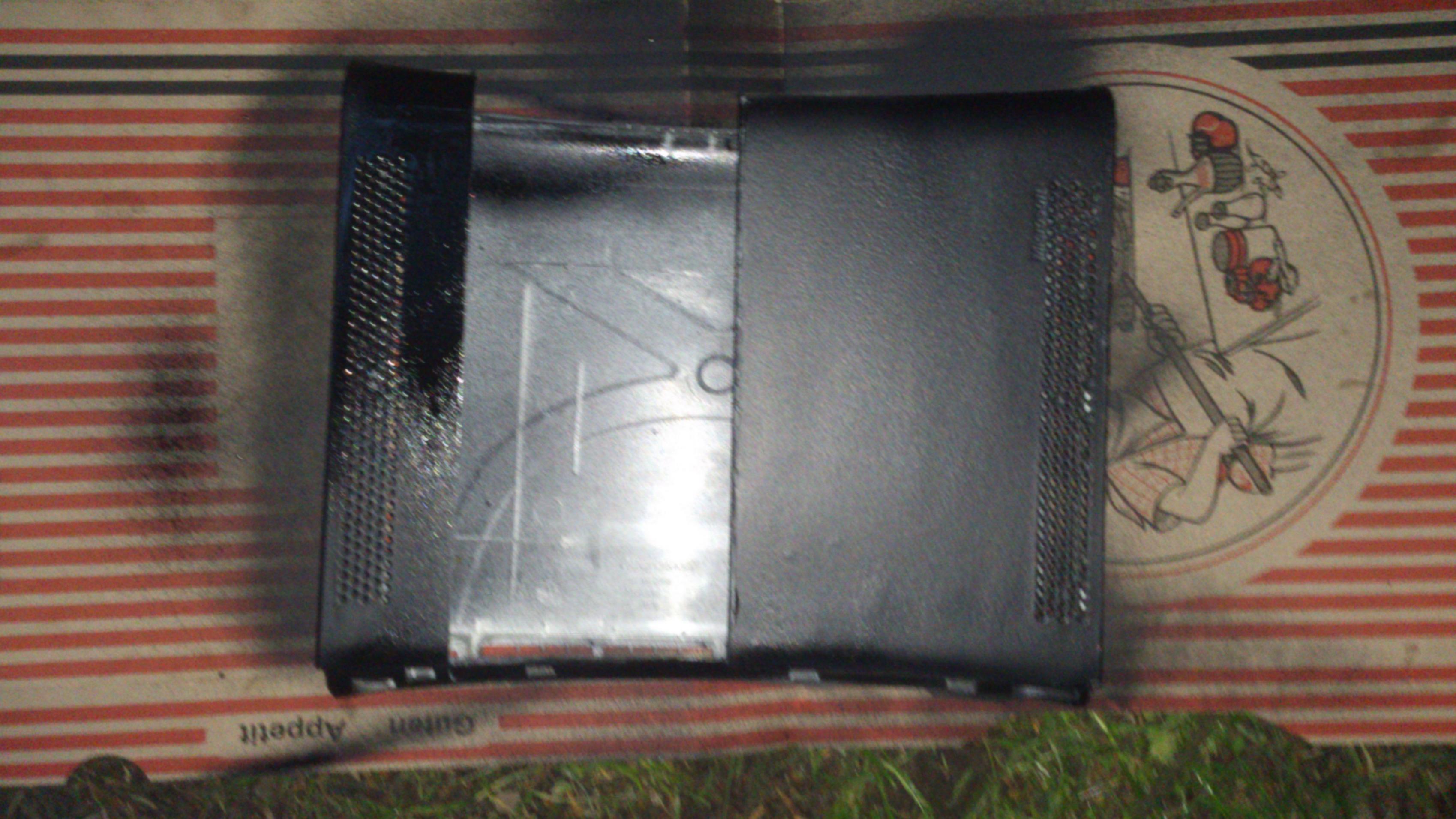 1. Zunächst nehmt ihr die Grafikkarte mit dem Adapter und messt den Umfang (Höhre u. Breite) der beiden und macht in Gedanken ein Rechteck draus. Ihr rechnet nun noch in der breite 5-10mm drauf, warum seht ihr Später, die beiden Maße behaltet ihr. Diese Rechtecktecke werden hinten in das PVC-gehäuse und in den Stalkäfig der Xbox reingesägt. Ich fange mit der PVC-unterseite der XBox an hier wird das GRÖßERE Maß genommen. Ich musste den Auschnitt leider nach oben platzieren, da meine Grafikkarte mit 240mm schon recht lang ist und durch das CD-Laufwerk habe ich ein wenig mehr platz, ist zwar ungünstig geht aber nicht anders. Somit steht die Grafikkarte, wenn man die XBox senkrecht hinstellt auf dem KOPF! Habt ihr dies nun gemacht sieht es ungefähr so aus: