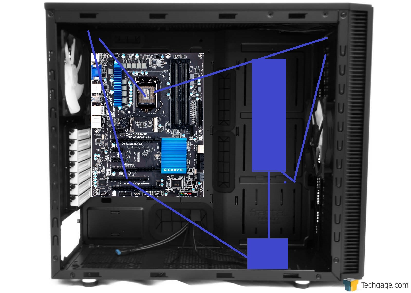 Es passt in der Front ein 360er rein. ABER nicht wenn ein 420er im Deckel Montiert ist! Das Maximale von der Fläche im Define S ist damit 420+280er Radiator. Alternativ, mit einem Lüfter mehr, aber etwas weniger Fläche: 2x360er Radiatoren.