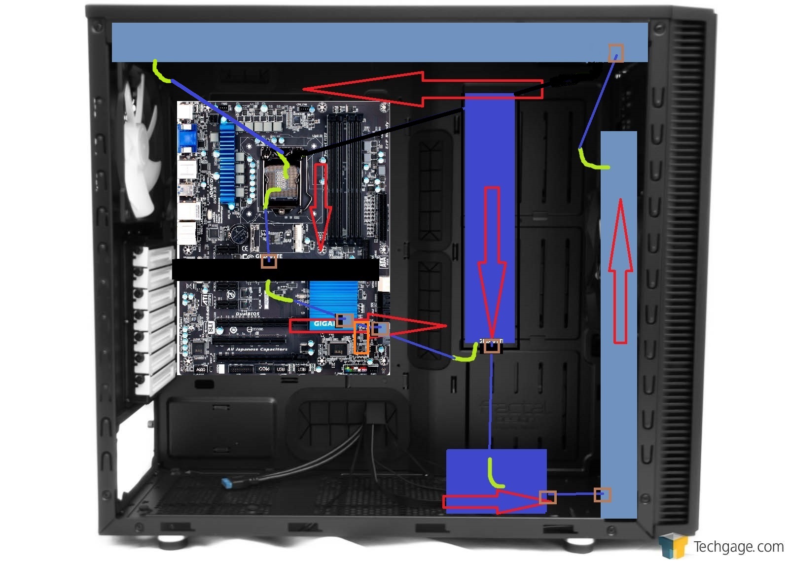 3: Die grünen sind die 90° Winkel, die braunen sind normale, zwischen Graka und AG sind 2 normale und dazwischen der Hahn