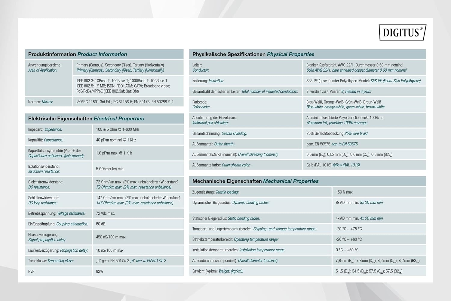 "DIGITUS 100 m Cat 7A Netzwerkkabel - S-FTP (PiMF) Simplex - BauPVO Dca - LSZH Halogenfrei - 1500 MHz Kupfer AWG 22/1 - PoE++ Kompatibel - LAN Kabel Verlegekabel Ethernet Kabel - Gelb"