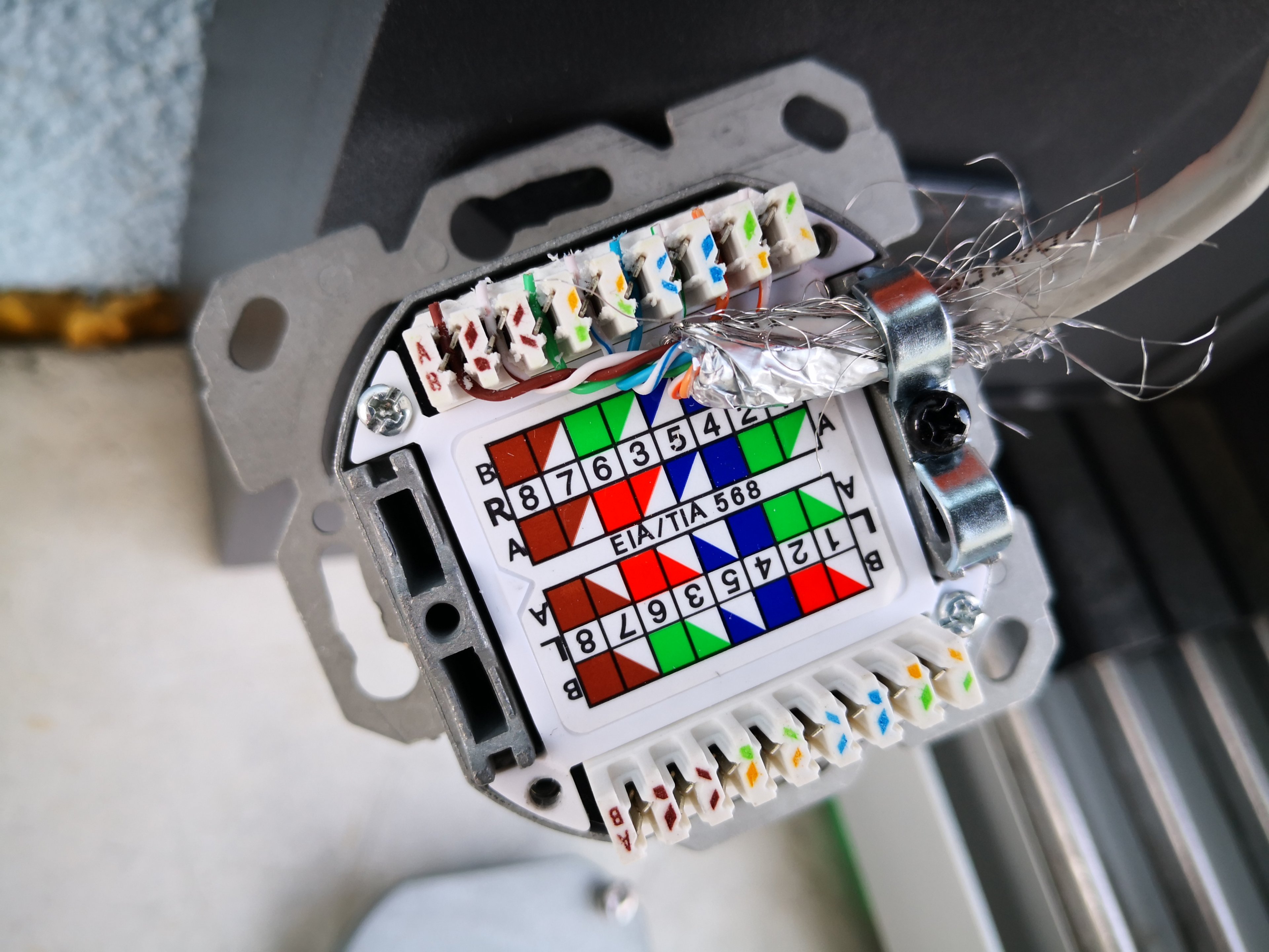 Ich habe ein cat5e Kabel im Haus verlegt wo ich auf einer Seite einen Lan Stecker (siehe Bild) an meinen gbit Switch anschließe und auf der anderen Seite das Kabel in eine cat6 Dose gepatchet habe.