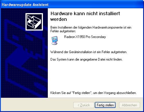 Wollte heute ne Runde CS:S zocken und dann kam Steam mit der Fehlermeldung "...bäh...Treiber zu alt...bäh..."! Also dachte ich mir, ich schmeiß mal die neusten Treiber drauf! Hab die alten Treiber deinstalliert und nach einem Neustart hab ich die exe, die ich von ATI heruntergalden hab ausgeführt und diese sagt mir, dass sie keine passenden Treiber für meine Hardware bzw Software fünde und beendet das Setup! Ich hab die Version für WinXP Home heruntergeladen und laut Geräte-Manager wird die X1950Pro erkannt!