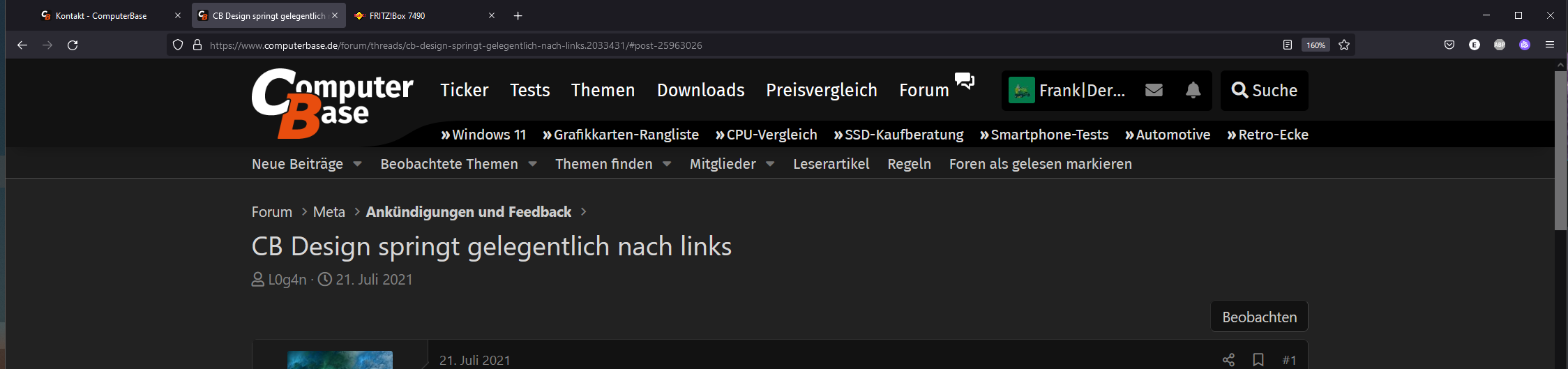 Das ganze kann ich sowohl im aktuellsten Safari unter macOS reproduzieren, sowie hier mit Firefox 90 unter Linux am Desktop. Unter größeren Bildschirmen fällt es natürlich weniger auf als zum Beispiel am Laptop.