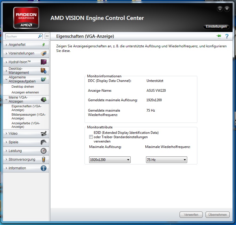 Wenn ich den haken raus nehme und auf 1920x1200 mit 75GHZ selber setze anstatt das es vom EDID kommt, kann ich diese Auflösung auch zumindest mit gestetzten 60hz fahren.
