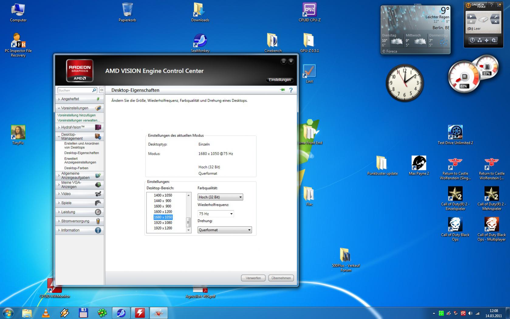 Ich kann hier anstatt maximal 1680x1050 bei 75HZ, wenigstens 1920x1200 bei 60HZ fahren die mir mein Bildschirm wohl runterskaliert auf 1600x1200, das sieht Hammer aus