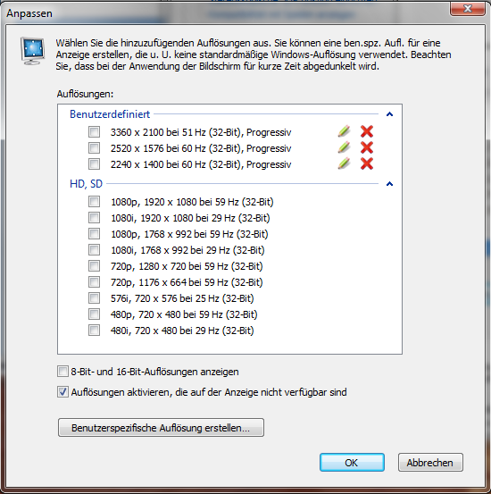Würd ich an deiner Stelle erstmal mit der kleinsten Auflösung anfangen und mich dann hochtesten. Nicht jeder Monitor schafft so hohe Auflösungen. Hab ich bissl Glück gehabt.