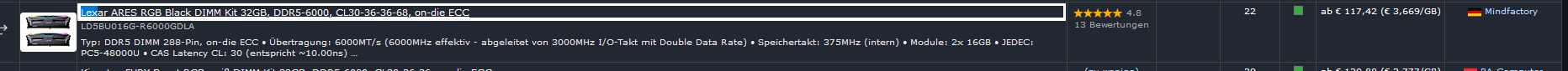 Ander sehe ich es bei den Budget PC. Das wirkt oft wie gewürfelt... Aber auch nicht immer! Die günstigtste noch ausreichende CPU! das finde ich gut. Aber nur nv?! einer macht das nicht... der Würfelt dafür Lexar rein.... 32 gb Lexar ares mit CAS 12ns ??!?!? Viel zu teuer und zu langsam! Beim Gaming brauch ich Latenz... ist ja nicht so das es das beste angebot ist... und ECC brauche ich beim Gaming nicht... Warum nich t3200 von Corsair und die 60€ in ne bessere gpu/cpu, why lexxar?